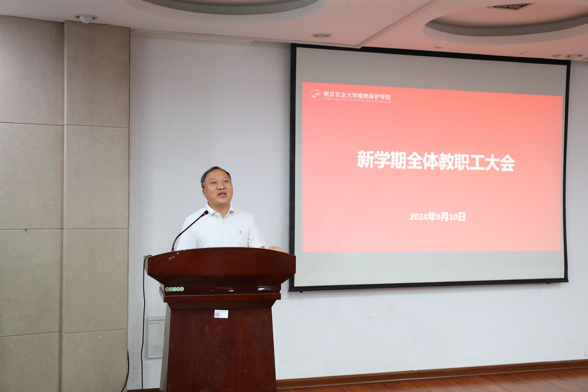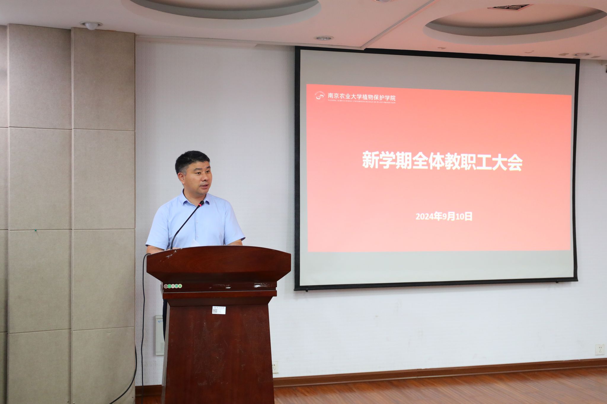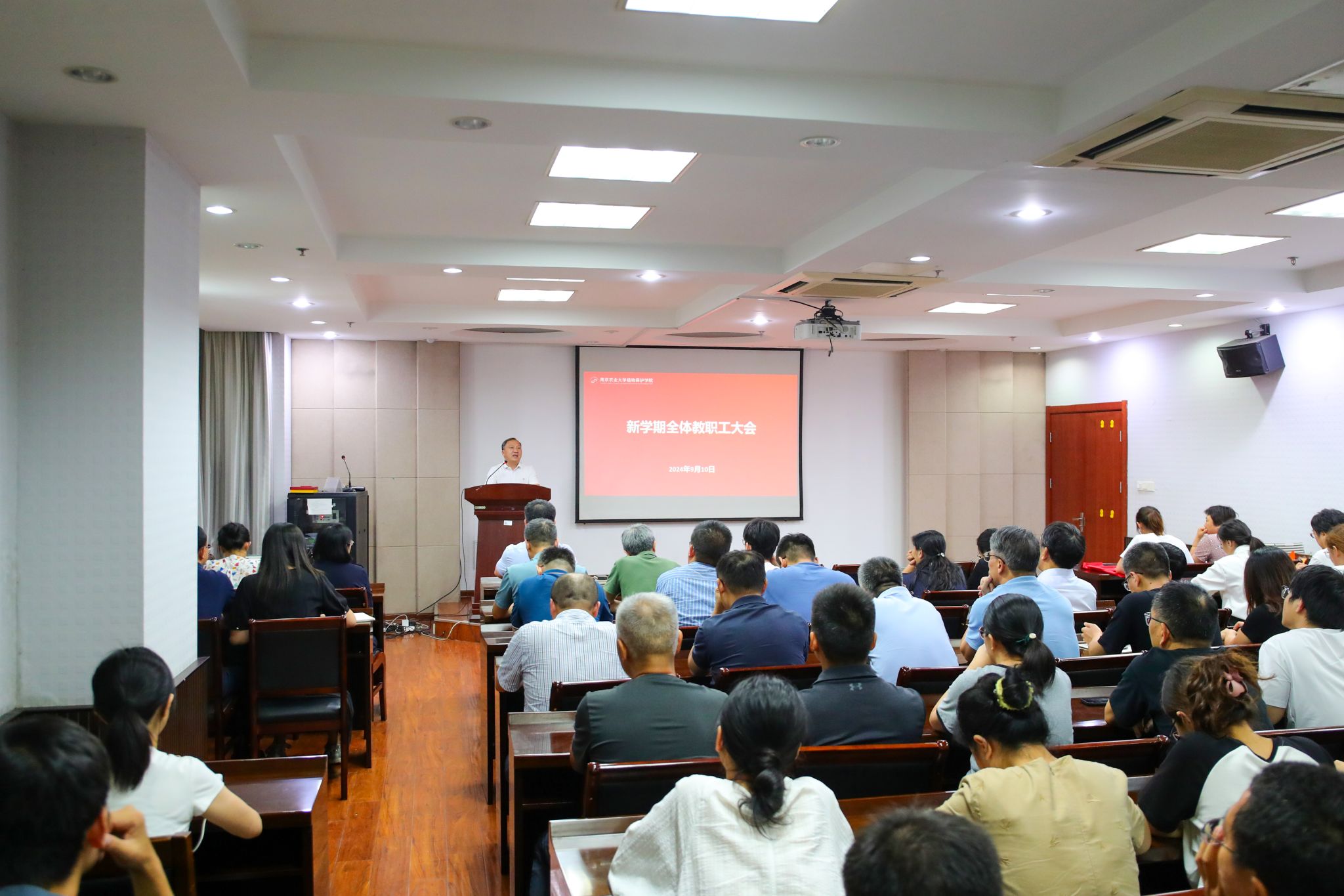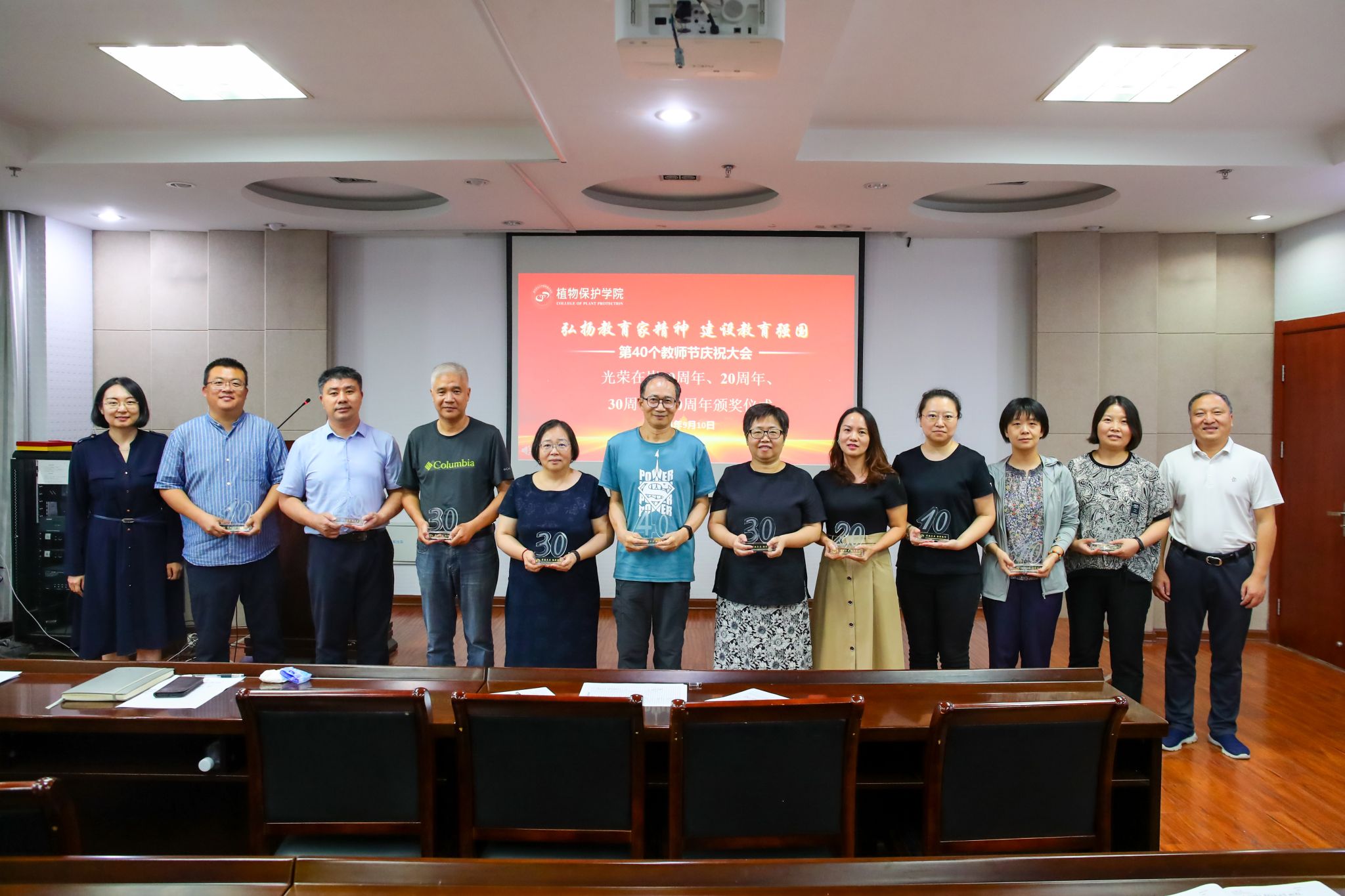 于理科楼C303隆重召开新学期全体教职工会议暨第40个教师节庆祝大会。大会分两个阶段举行,分别由学院党委书记许承保、党委副书记吴智丹主持,全体教职工参加。