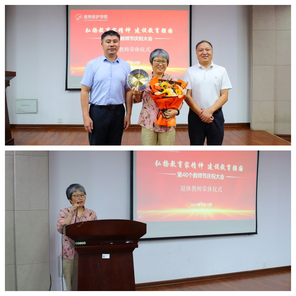 在退休教师荣休仪式上,张正光、许承保为2024年荣休教师宋从凤赠送鲜花及纪念品。宋从凤老师回顾了自己在南农求学与工作的时光,见证了学生的成长与学校的快速发展,言语之中满怀着对教育事业、对学院及所在岗位的热爱之情。