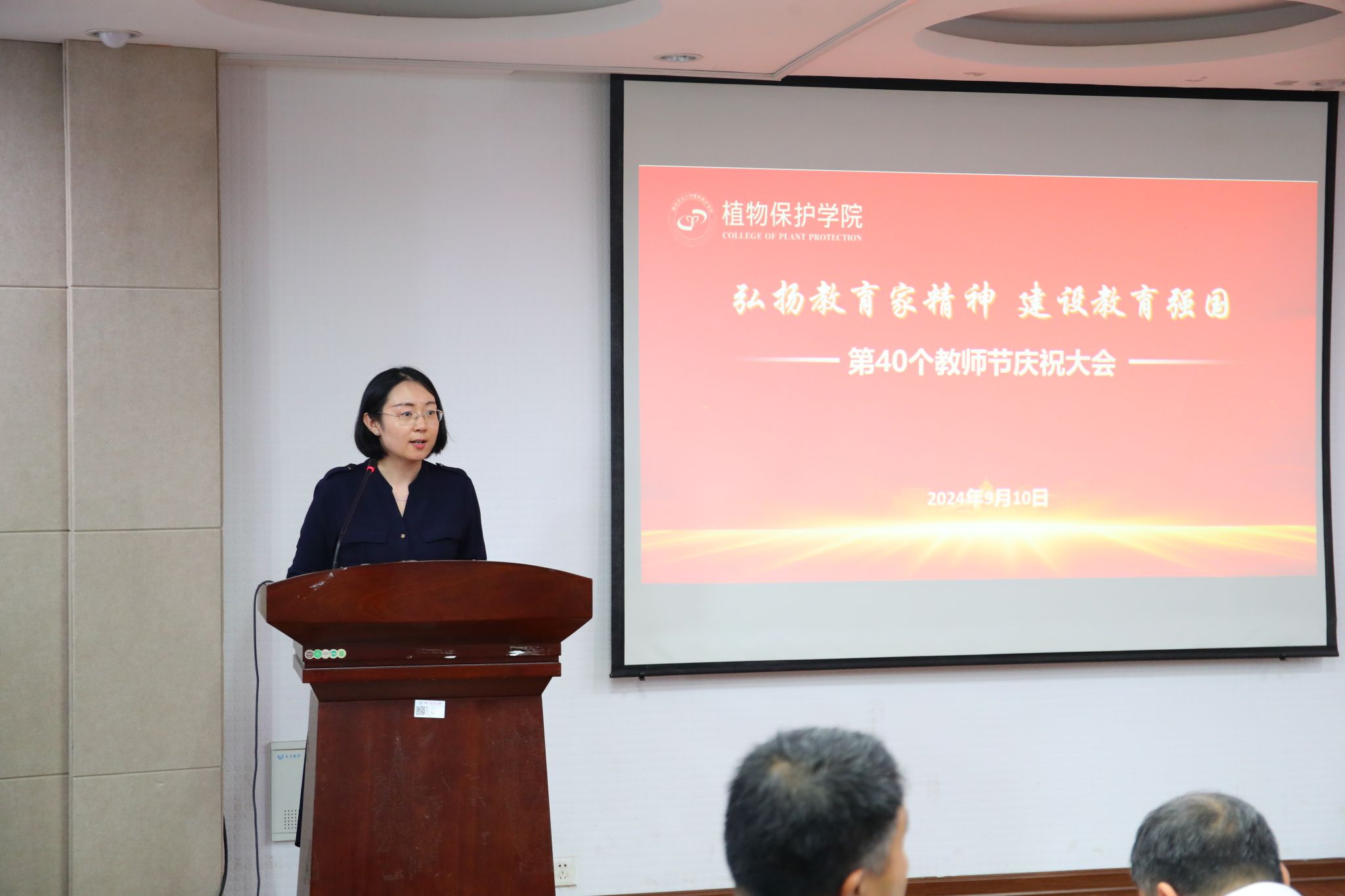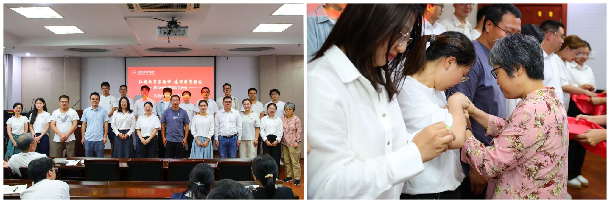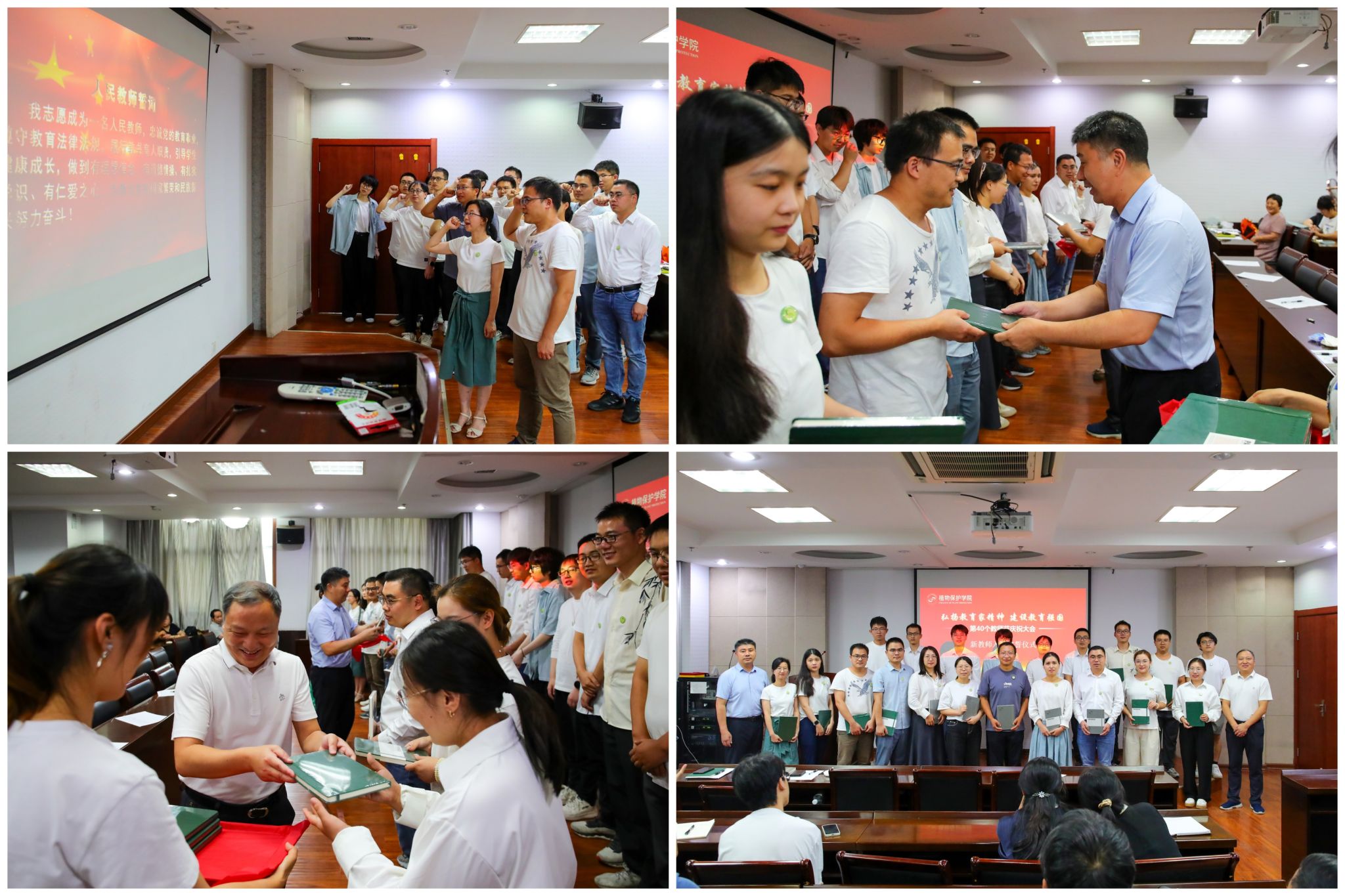 在以“弘扬教育家精神,建设教育强国”为主题的庆祝第40个教师节大会上,20位新入职教师依次作自我介绍,荣休教师宋从凤教授为新教师代表佩戴院徽。新教师进行了入职宣誓仪式,他们紧握右拳,庄严许下一名人民教师的神圣承诺!