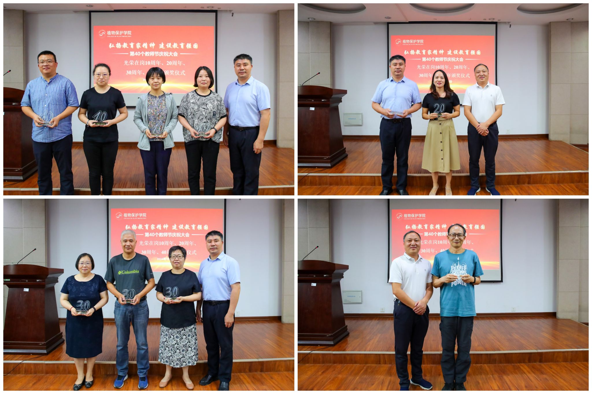 张正光、许承保分别为光荣在岗10周年、20周年、30周年、40周年的教职工颁发纪念奖杯。朱敏、施海燕、徐衡、孙长海等4位老师作为教师代表分享了个人工作以来的感悟。