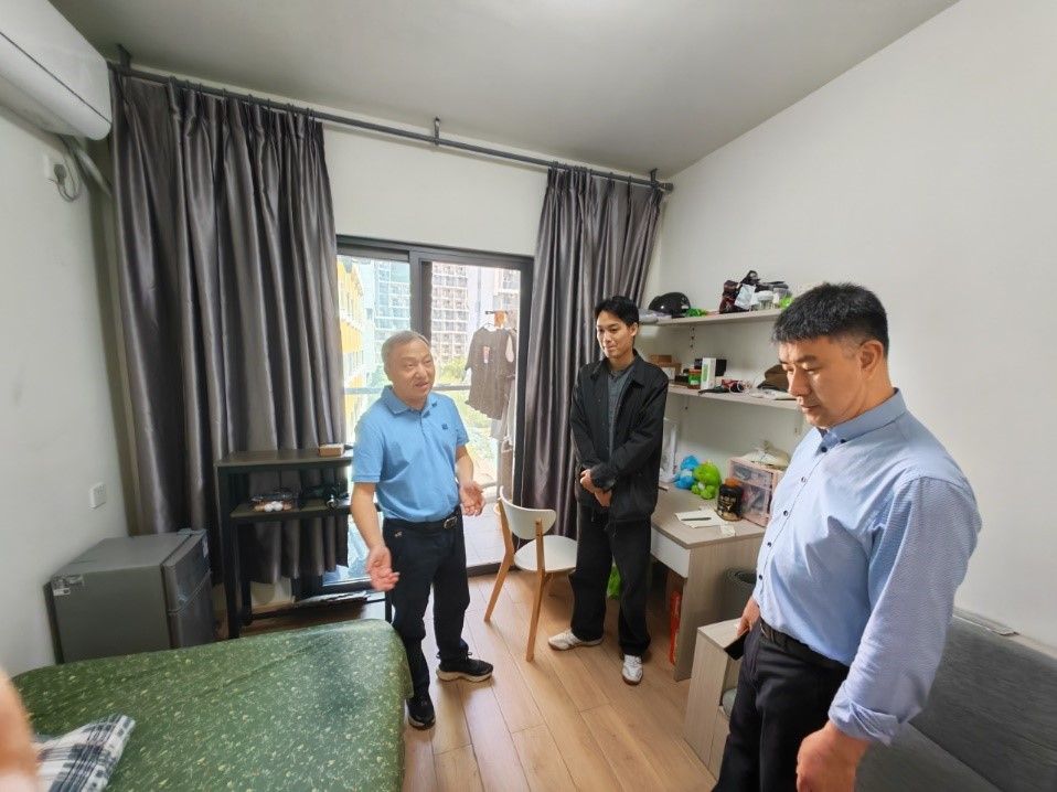 在创新研学谷,许承保、张正光来到学生宿舍,慰问了海南专项学生,了解了同学们的生活状态,并来到现代农业与绿色生产实验室,对各团队的科研攻关情况进行了解,提出指导意见。