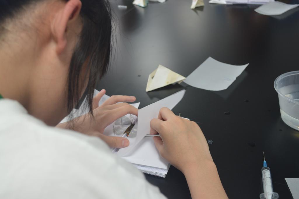 在实验互动环节,宜兴中学的同学们在老师的讲解和志愿者的协助下,亲手制成漂亮的蝴蝶标本,体验昆虫标本制作过程;通过显微观察识别常见植物病原物的形态,感受微观世界的魅力。