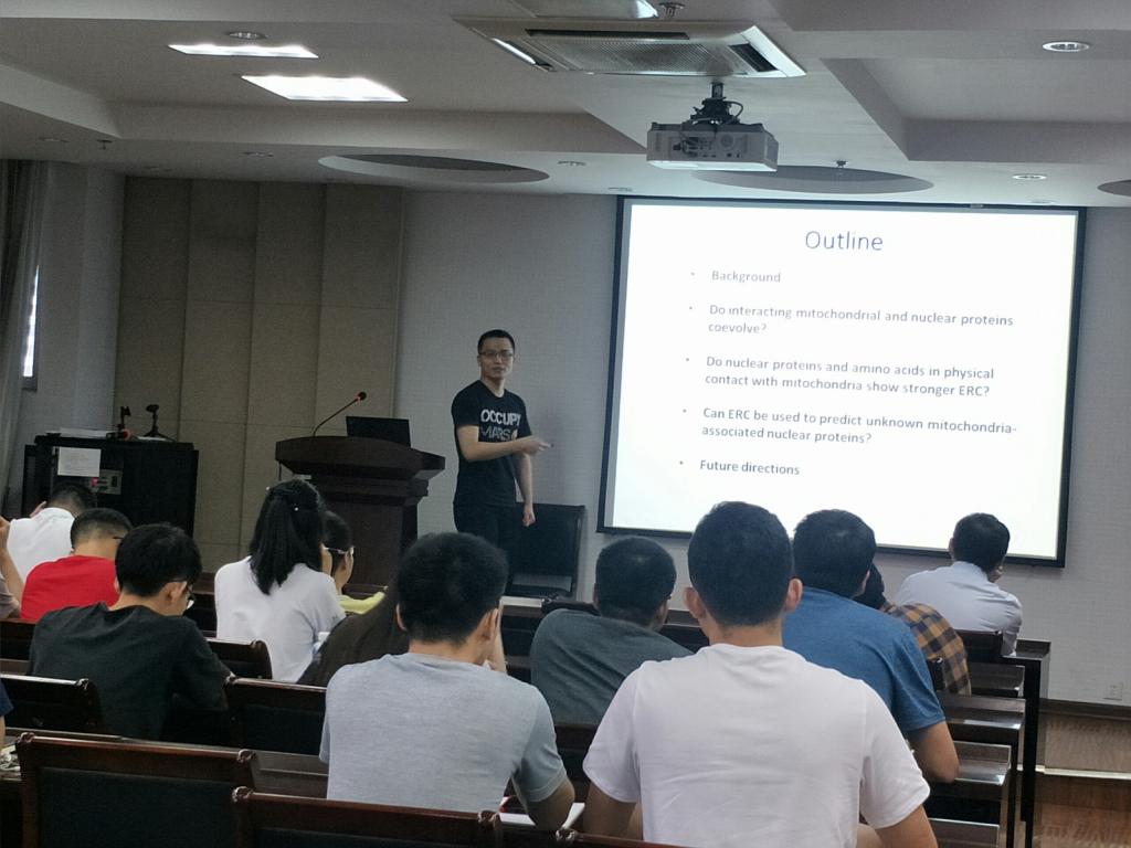 王磊博士,目前在瑞士伯尔尼大学植物科学研究所,主要从事虫害诱导植物挥发物的识别及信号转导的研究。读博期间成功鉴定出细菌冷基蛋白受体和番茄系统素受体。他的报告主要讲述了植物免疫中的信号感知与整合。严智超博士,在美国罗彻斯特大学做博士后,主要研究寄生蜂来源的杀虫基因挖掘、及昆虫线粒体与核基因的协同进化等。在报告中,他主要讲述了与线粒体物理接触的核蛋白和氨基酸是否表现出更强的ERC,以及ERC能否用于预测与线粒体相关的未知核蛋白。
