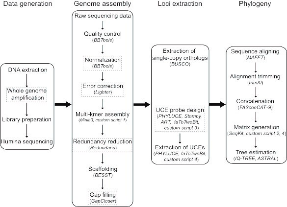 昆虫分类团队在国际著名生态与进化学术期刊Methods in Ecology and Evolution(影响因子6.363,五年影响因子9.881)在线发表了题为“Phylogenomics from Low‐coverage Whole‐genome Sequencing”的研究论文。该研究提出了一种新的基于全基因组鸟枪测序法(WGS)的分析流程,可以从低深度测序的基因组数据中快速从头组装基因组,并使用一系列高效的生物信息学工具来提取常用的系统发育基因组分子标记。番号鸽
