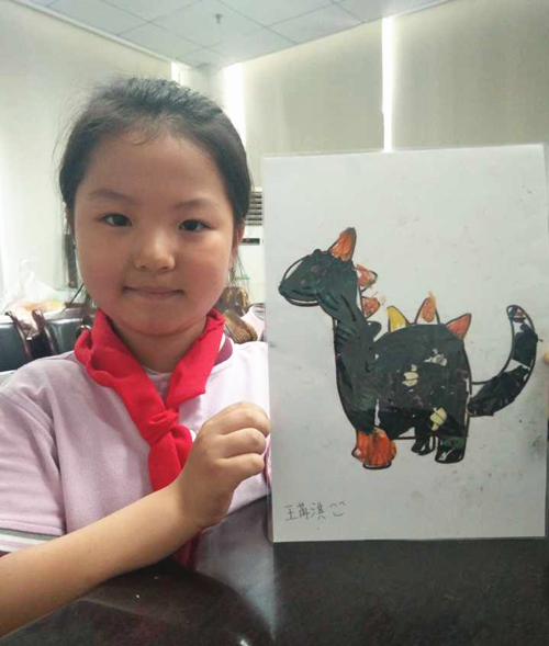 一幅蝶翅画,拼贴出奇妙想象。在展示精美的蝶翅画作品后,小朋友们都跃跃欲试。在负责蝶翅画教学的队员们带领下,孩子们挥洒着大胆新奇的想象力,用各式各样的蝴蝶翅膀进行着创作,不一会儿的工夫,课堂上就出现了一只只五彩斑斓、栩栩如生的恐龙……