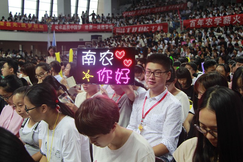 新生典礼开始前,各院辅导员和学生干部们就已经带领着各学院新生们有序进场。在等待领导们进场时,各院新生挥舞着灯牌和横幅,番号鸽