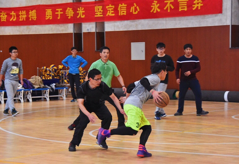 裁判的哨音刚落,参赛队员如离弦的箭般冲了出去,激烈的比赛开始了。球权转换间,143班球员们以高效的进攻与稳妥的防守迅速将比分拉到16:4,暂时领先教师队。比赛第二节院长王源超的上场瞬间将全场的气氛推向高潮。教师们不管是出色的配合,还是“孤身一人”控球突破都让场下观众惊呼叫好,同时老师们的速度、技巧一点都不输于年轻的学生们。比赛甚是精彩,场面极其激烈。最后王院长以一记漂亮的三分结束比赛,教师以精湛的球技与巧妙的配合反败为胜,以64:60的优势赢得比赛。