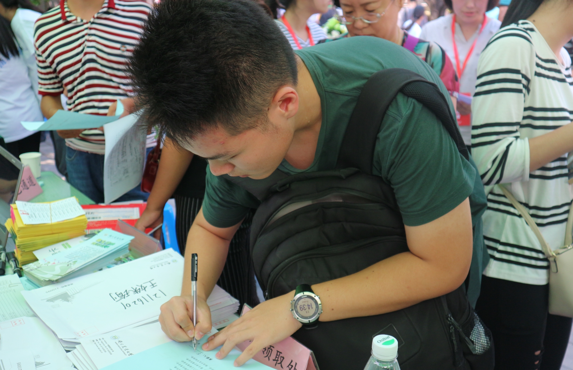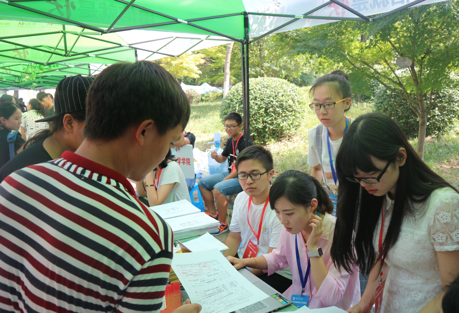 志愿者,虽然已是满头大汗,但大家的激情却有增无减。他们面带微笑,高举指示牌,为新生及家长指引方向,为他们卸下沉甸甸的行李,缓解舟车劳顿的疲惫。