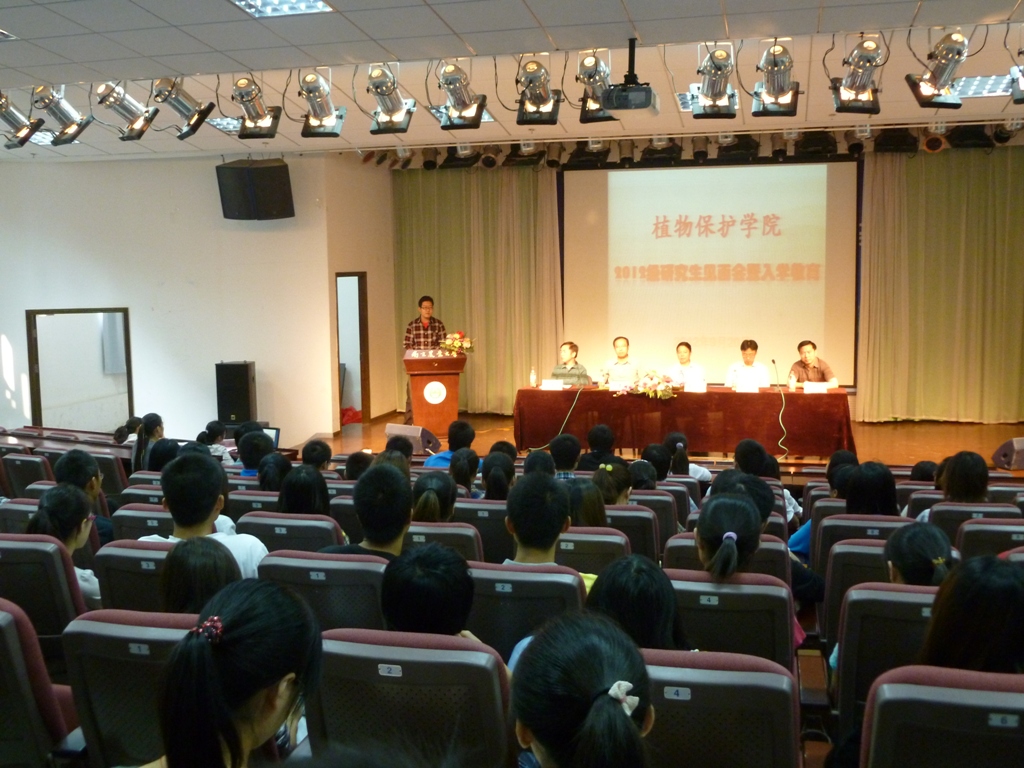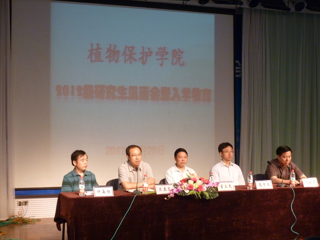 2012级研究生见面暨入学教育大会在教四楼报告厅成功举行,院党委书记董立尧、院长吴益东、副院长高学文及昆虫系主任洪晓月出席,会议由副书记许再银主持。