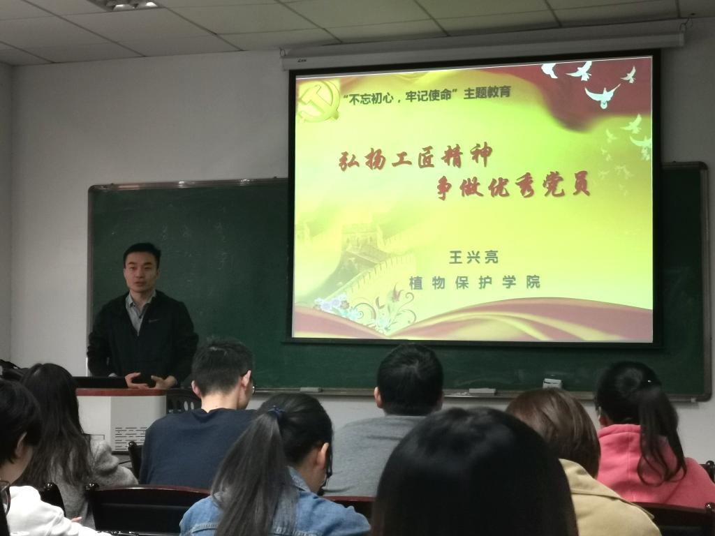 副院长王兴亮以“弘扬工匠精神,争做优秀党员”为题开讲专题党课。他从2019年诺贝尔化学家说起,围绕新时代的呼唤、新征程的使命和新常态的要求,从党的历史长征路、学院党建大方向、学术发展新高度三个方面,结合丰富生动的案例,阐述了弘扬“工匠精神”在学科建设和学生党建工作中的实际意义。王兴亮指出大国工匠的敬业、精益、专注、创新精神适用于新时代科技工作者,更应是当代广大青年学子的目标与追求。作为农业科技人员,他希望同学们潜心钻研农业科学,把平凡的工作做的不平凡,把不可能的事情做成可能,向上的青春,要想下扎根,争做优秀党员。