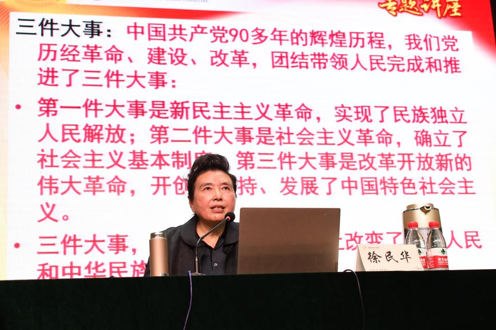 “不忘初心、牢记使命”主题教育理论学习会在大学生活动中心举行。江苏省委党校二级教授、江苏省委党的十九大精神宣讲团成员徐民华,应邀作题为《新时代中国共产党的历史使命》的专题报告。全体在校师生党员和党建班学员近400人参加学习会。学习会由副院长王兴亮主持。