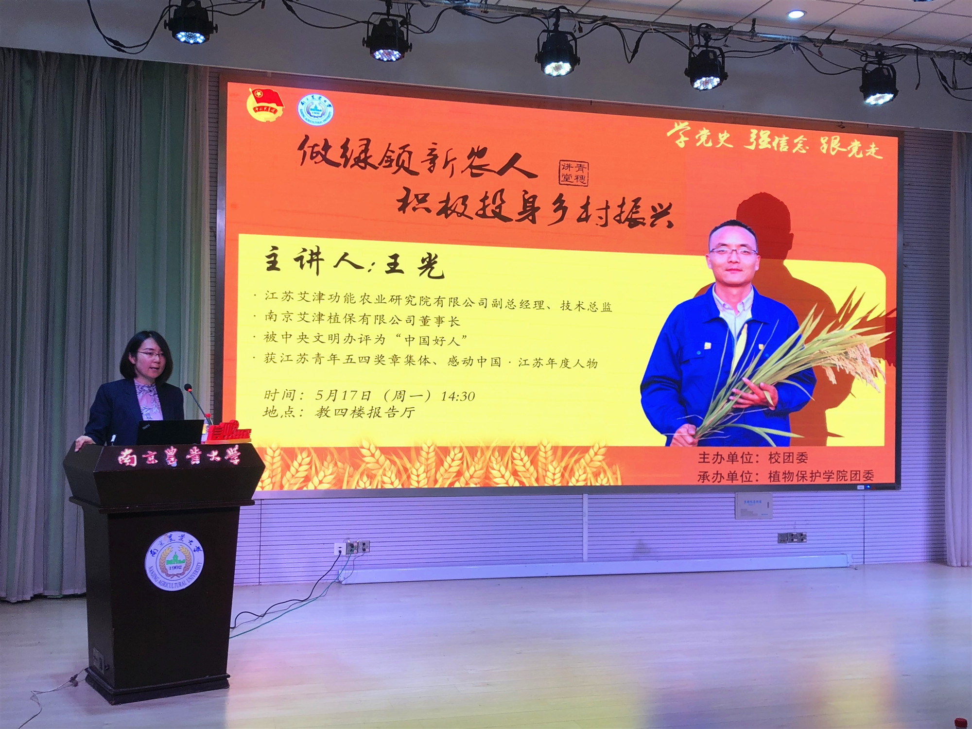5月17日下午,江苏艾津功能农业研究院有限公司副总经理、技术总监,南京艾津植保有限公司董事长王光做客我校第40期青穗讲堂,带来以“做绿领新农人,积极投身乡村振兴”为主题的分享。本次活动由校团委主办,番号鸽