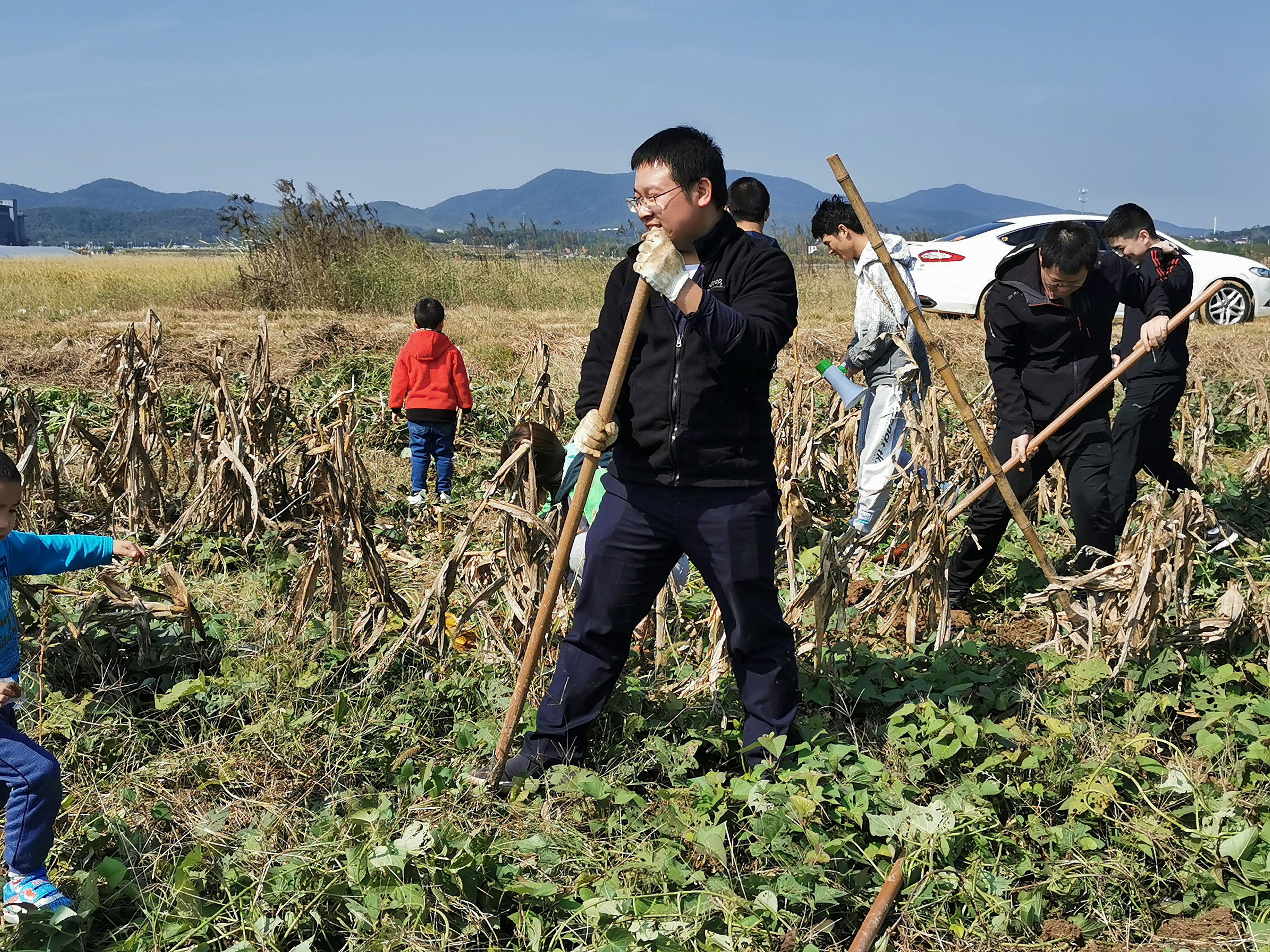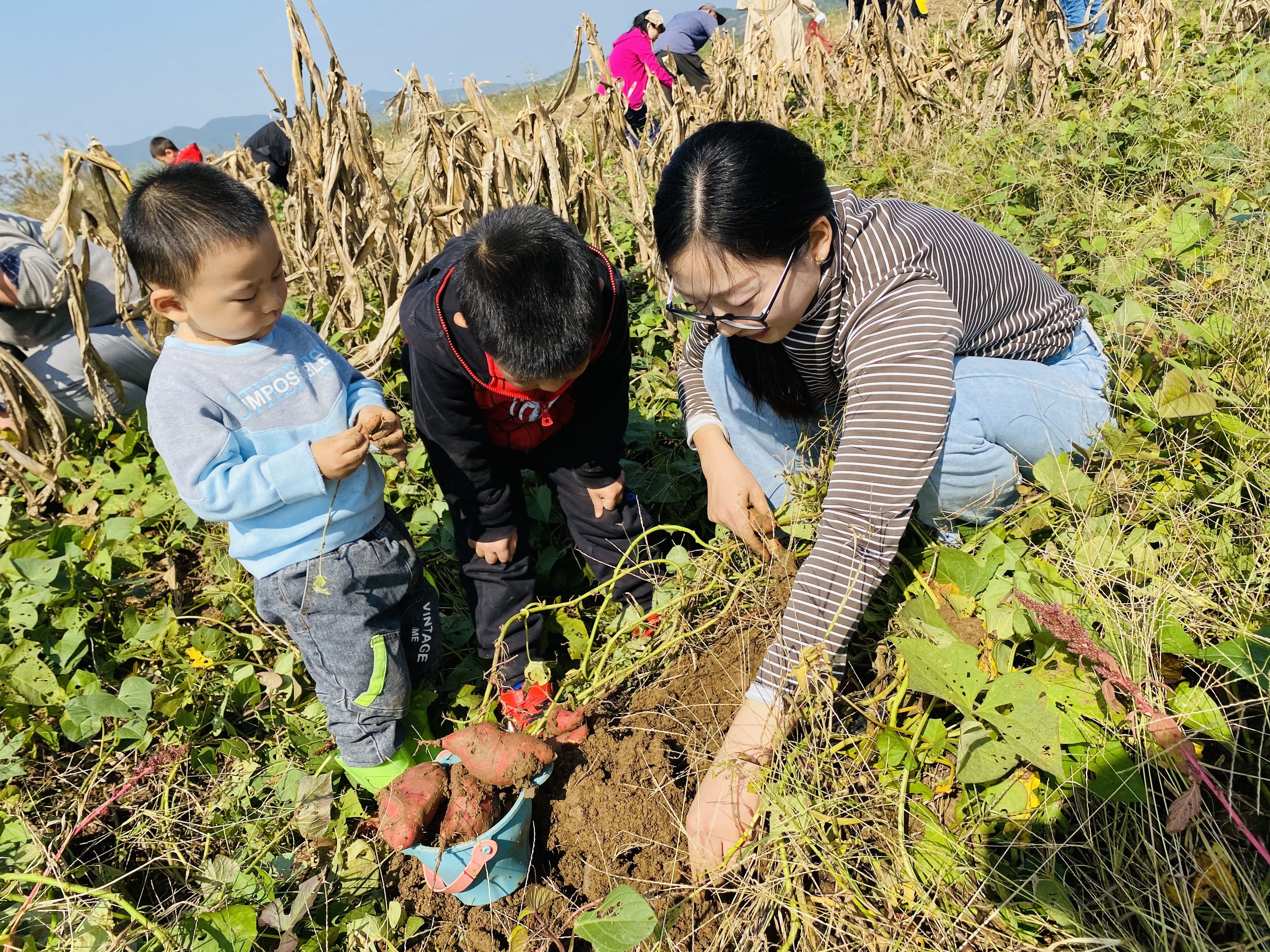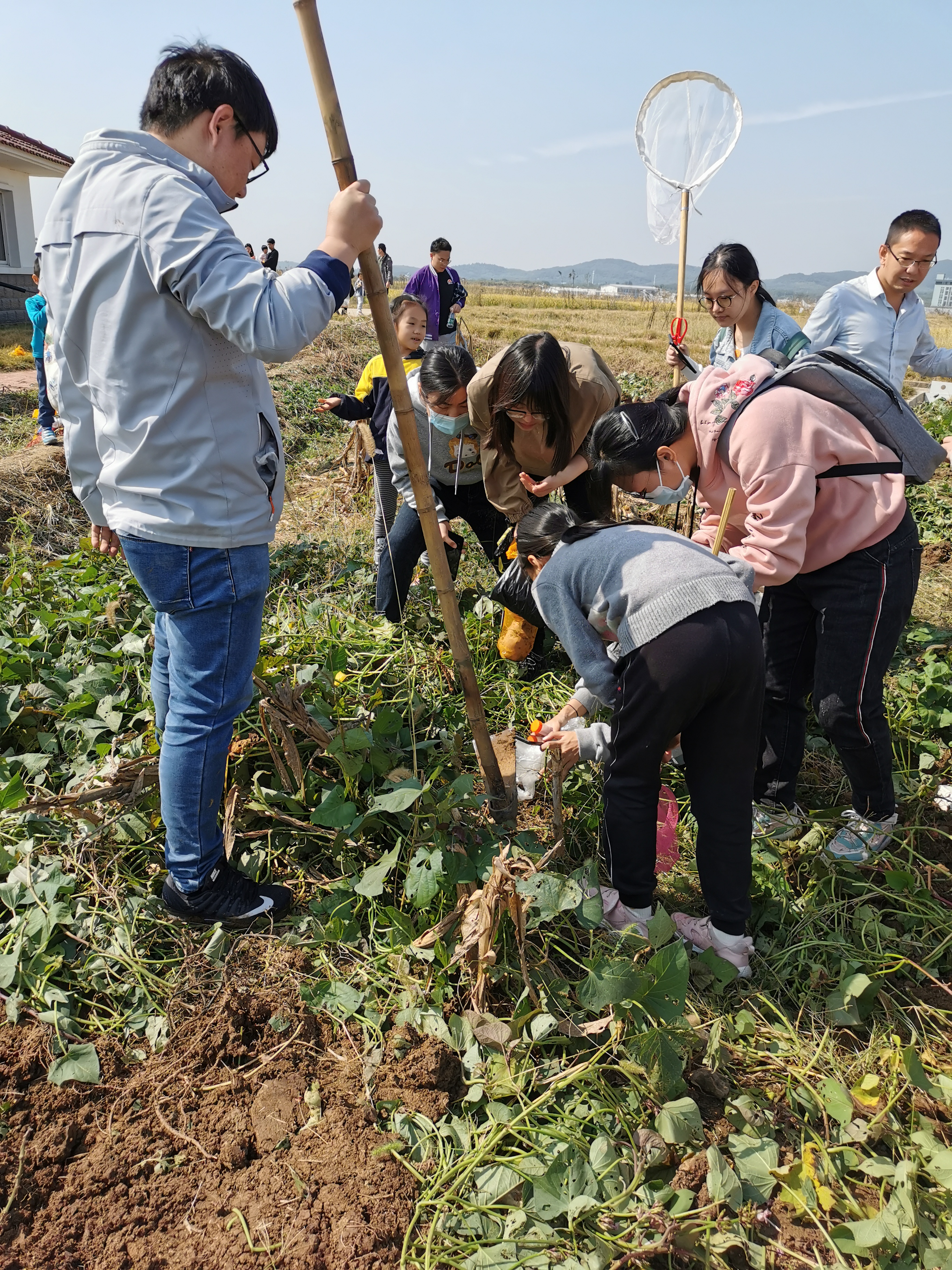 来到工会农场,大家立刻热情高涨地投入到劳动中,大人刨地,小孩采花生,收红薯。大家分工合作,你追我赶。小朋友的热情尤其高涨,完全进入了劳动状态,不怕脏,不怕累,收获一袋又一袋。活动中,老师们的专业素养充分体现,开展了妙趣横生的现场教学,为大家讲解了地下害虫和红薯上的病害,让知识普及和田间劳动相结合,寓教于乐,劳逸结合。