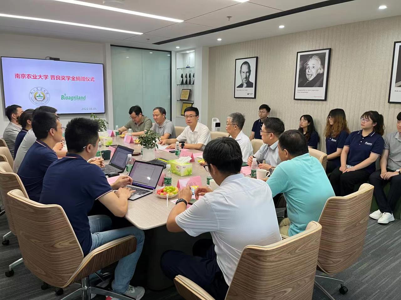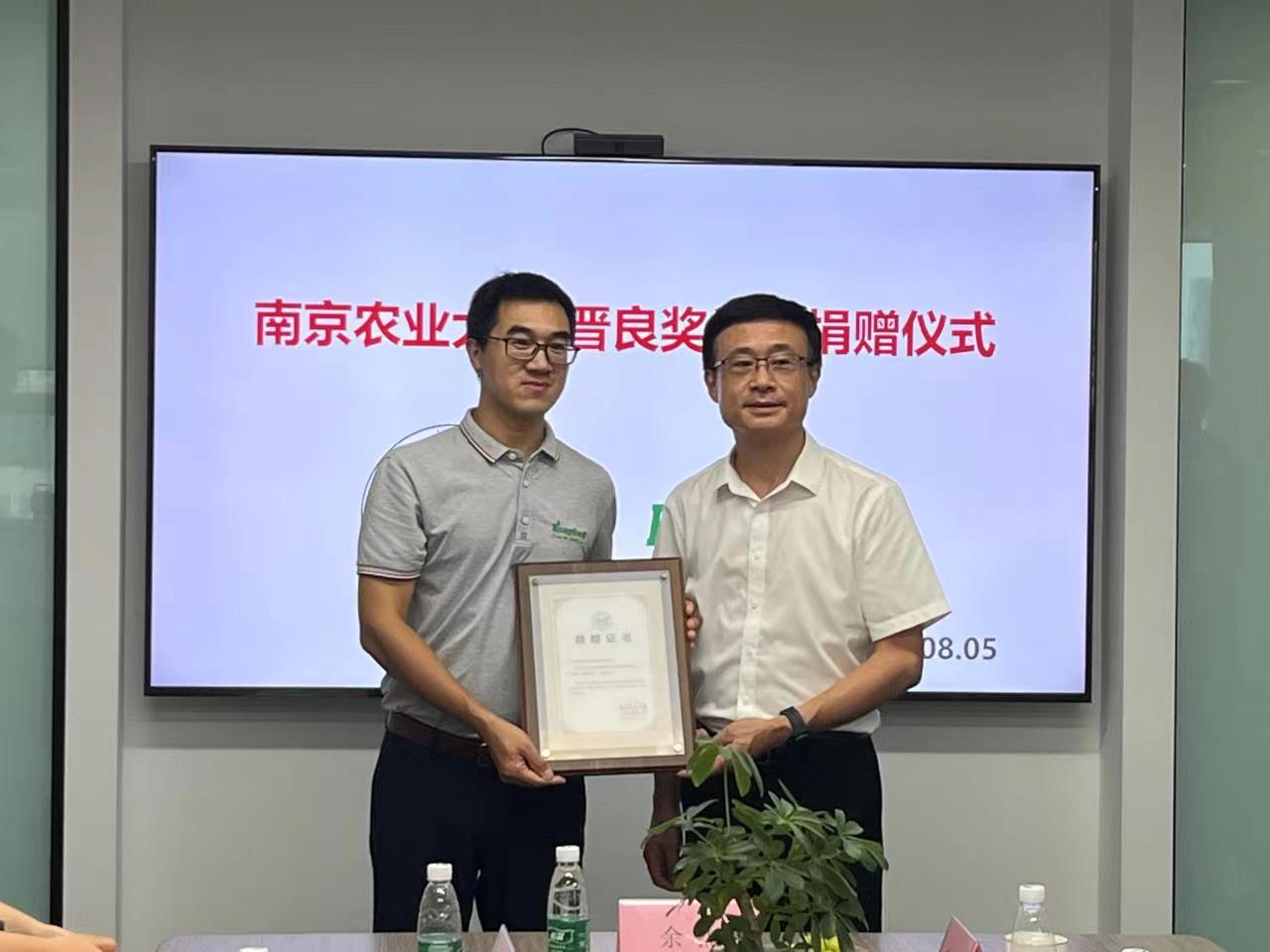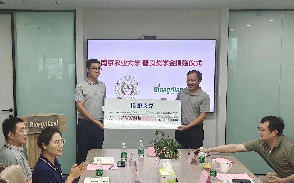 、南京博兰德生物科技有限公司共同发起成立农药学科发展基金,博兰德捐赠100万元做为晋良奖学金启动资金,鼓励学生勤奋学习,开展高水平创新性科学研究。李赟向学校捐赠支票,胡锋代表学校基金会颁发捐赠证书。