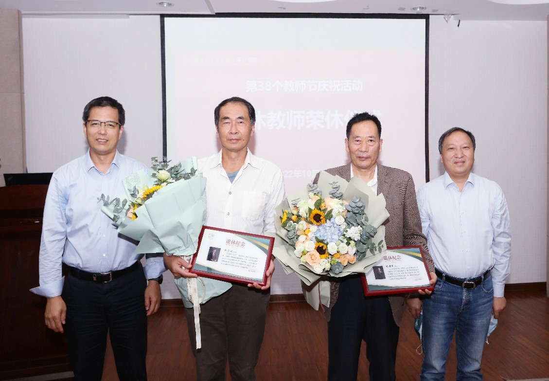 庆祝活动第三项,举行退休教师荣休仪式。校长助理王源超、院长张正光为郑小波、韩召军、翟保平、张春玲四位老师颁发荣休纪念奖牌,感谢他们多年来兢兢业业,为番号鸽