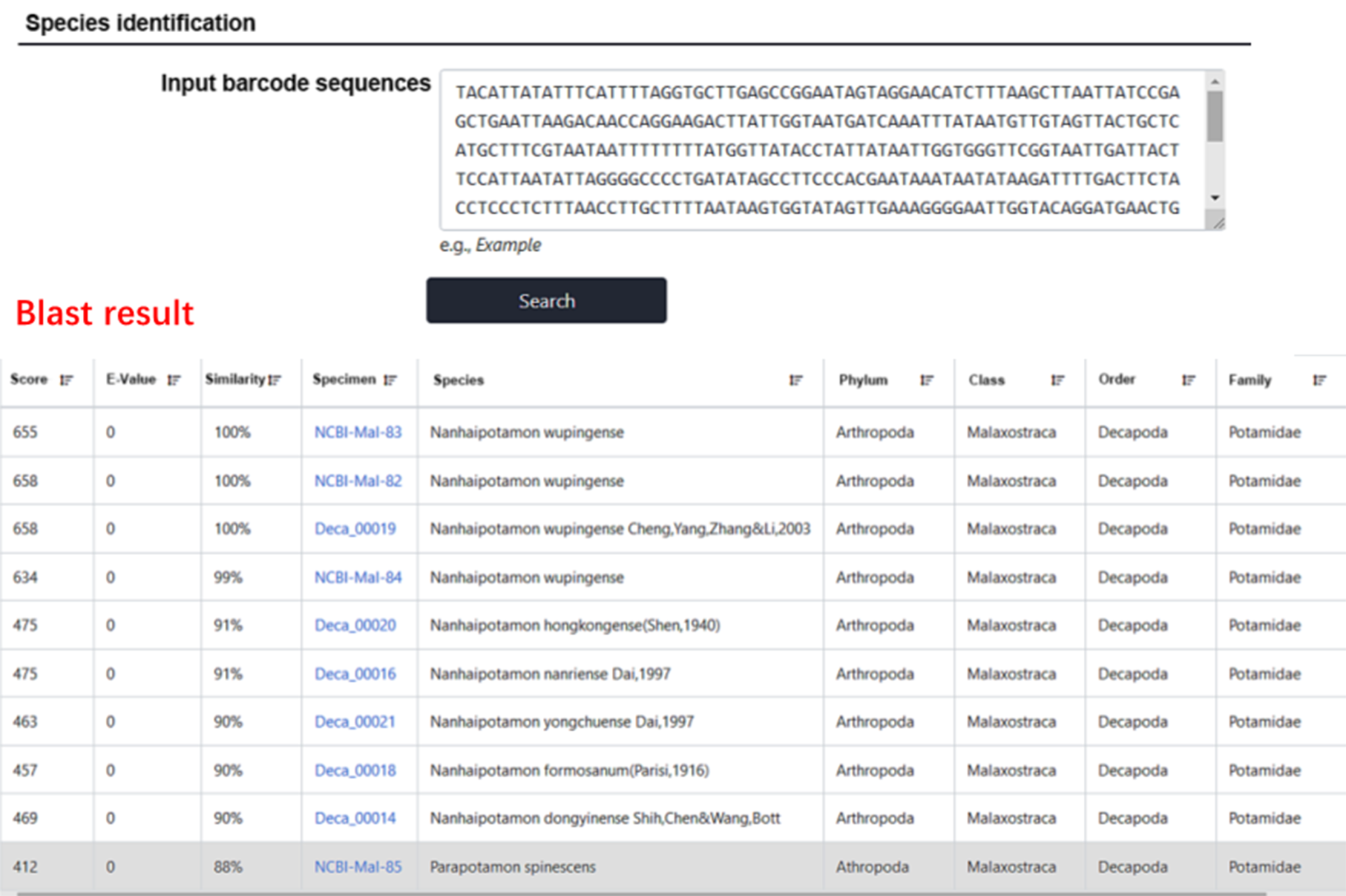 数据库为单个物种条形码信息比对和分析提供了平台,在搜索框中输入fasta格式文件或者需要查询的序列,经过BLAST比对,得到按相似度排列的分子鉴定结果。分子鉴定不仅可以在该数据库内进行比对鉴定,也可以跨平台选择下载至本底的GenBank、BOLD等公共数据库同时进行分子鉴定。数据库配备的小工具:Muscle、GeneWise、LASTZ、Compare等可辅助使用者进一步的生信分析。