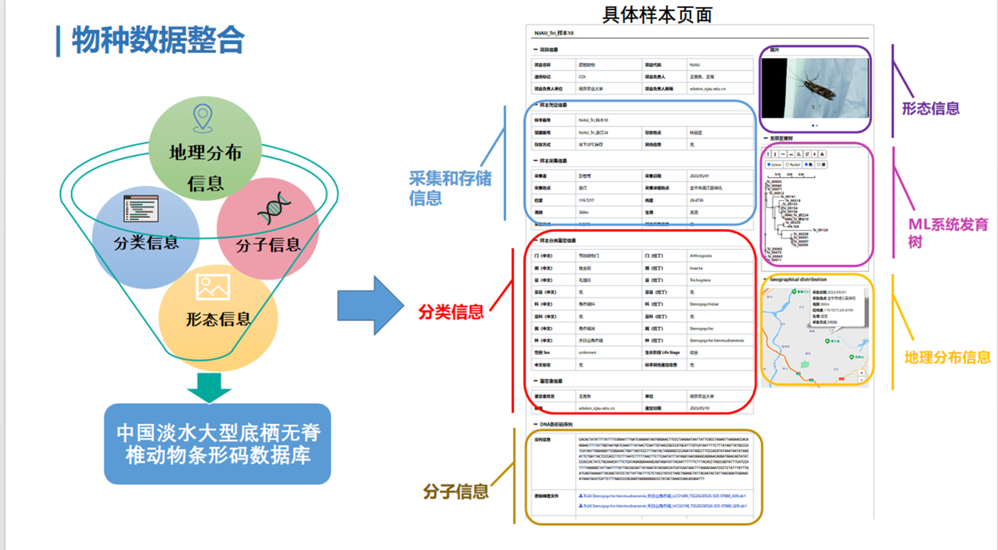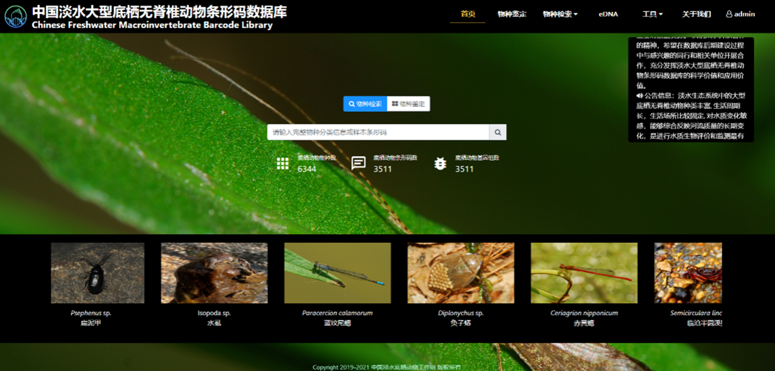 数据库现收录有中国淡水底栖无脊椎动物分类名录共6300余种,有条形码的物种数1300余种,总DNA条形码数3200余条,线粒体基因组100多个。数据库整合了同一物种的分类、分子条形码、地理分布以及不同虫态形态图像等信息,从而有利于物种的整合鉴定。同时支持分类阶元、关键词、地理分布等三种不同方式的信息检索,支持按筛选条件检索和结果排序,方便用户查找需要的数据资源