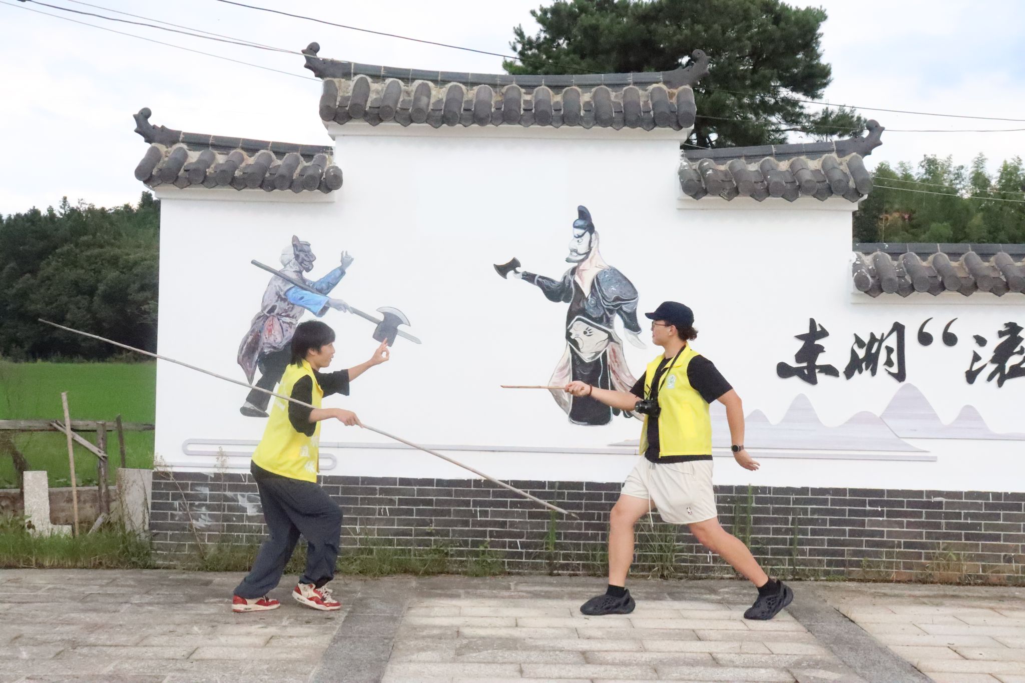 “东湖‘滚傩神’已有近千年历史,它被当地作为驱邪纳福、保境安民的一种仪式传承延续至今。东湖傩舞是‘武傩’,《鸡嘴》《猪嘴》是其最具特色的两个节目。”东湖村村民向实践团热情介绍道。在古傩神庙,实践团成员认真倾听村民解读展板内容,重点研读东湖傩舞文化内涵,学习傩舞发展历程和传承情况。在傩舞演绎广场,实践团成员被古朴粗犷又刚中有柔的舞姿吸引,自发模仿起傩舞经典动作,与千年非遗文化展开了一场沉浸式的时空邂逅。