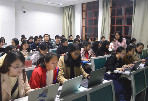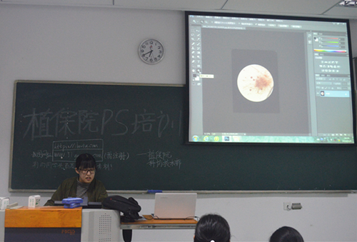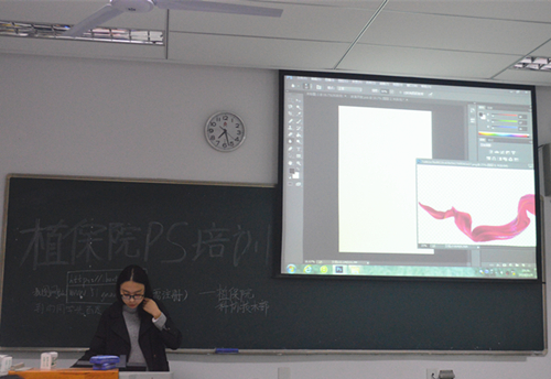 首先,技术部成员帮助同学们安装好PS软件,并介绍了一些可获得PS素材的优秀网站。在确保大家的学习进度一致后,部长徐秋轩给同学们展示了打开文件和放大图片等基本操作,介绍了工具栏中一些常用工具的使用方法及适用场景。讲解中,徐秋轩不时放慢节奏解答同学们的疑惑,较难的步骤多次演示,并用更加简洁易懂的语言促进同学们理解和掌握。同学们踊跃举手,积极求助,表现出了对PS学习的极大热情;技术部的其他成员也在教室里认真指导,耐心解答,一对一地帮助同学们解决问题。