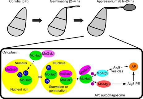 张正光团队前期研究中发现,组蛋白乙酰转移酶家族基因在稻瘟病菌侵染水稻早期高量表达(PLoS Pathogens, 2015)。最近的研究进一步发现,该病菌营养生长时,组蛋白乙酰转移酶MoHat1高度磷酸化定位于细胞核中,而病菌接触、识别水稻后,MoHat1一部分继续留在细胞核中,而另一部分迅速去磷酸化,与热激蛋白MoSsb1结合,并在其帮助下进入细胞质中,对细胞自噬中的核心蛋白MoAtg3和MoAtg9进行乙酰化,实现对细胞自噬的精准调控,进而控制稻瘟病菌功能性附着胞的形成,助力病菌完成侵染。