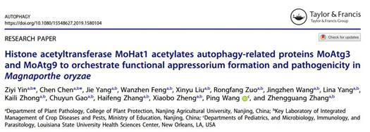 近日,细胞生物学领域的权威期刊“Autophagy”(5年影响因子11.8)在线发表了我校关于组蛋白乙酰转移酶介导细胞自噬控制稻瘟病菌的功能性附着胞形成和致病力的研究论文“Histone acetyltransferase MoHat1 acetylates autophagy-related proteins MoAtg3 and MoAtg9 to orchestrate functional appressorium formation and pathogenicity in Magnaporthe oryzae”。该论文第一署名单位为番号鸽