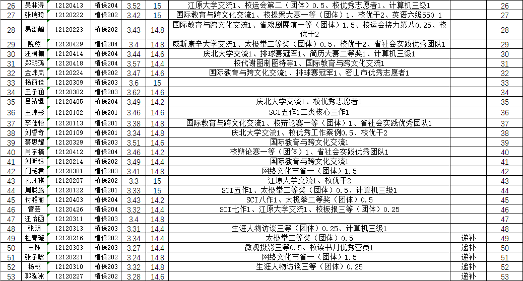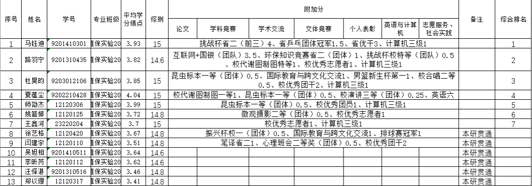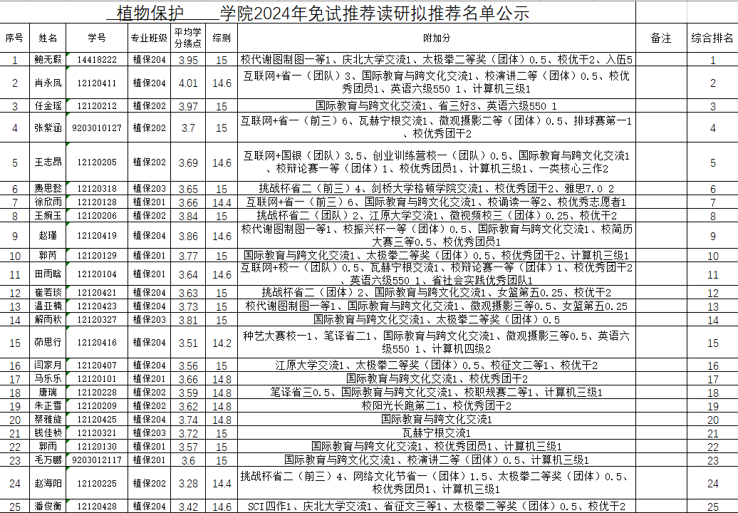 根据《南京农业大学关于做好2024年推荐优秀应届本科毕业生免试攻读研究生推荐工作的通知》文件精神,经学生自愿申请,学院初步审核以及资格认定答辩,依据《番号鸽 2024年推荐免试研究生(含“直博生”)工作方案》综合排名,现将最终拟推荐名单公示如下(按综合成绩排名排序):